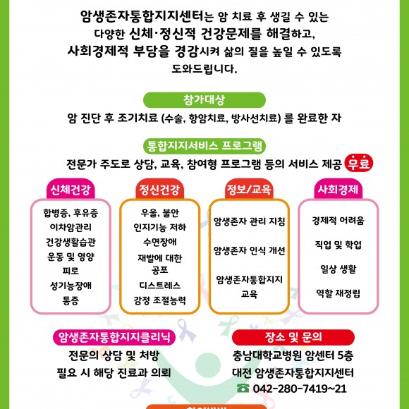 암 치료 후 생길 수 있는 다양한 신체, 정신적 건강문제를 해결하고 사회경제적 부담을 경감시켜 삶의 질을 높일 수 있도록 도와 드립니다.